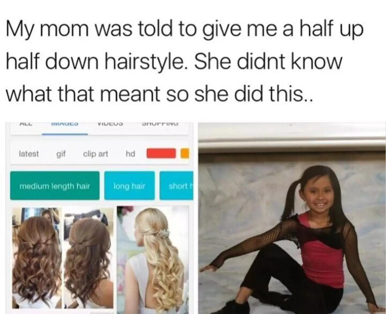 «Моя мама объяснила, что мне нужна прическа, где половина волос распущена, а другая половина — собрана. Мастер не поняла, что это значит, и сделала вот это».