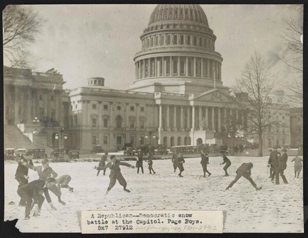 Идеальные политические дебаты: снежная битва республиканцев и демократов перед Капитолием, 1921 год.
