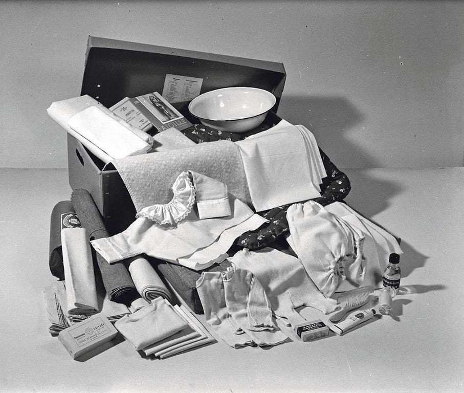 Материнский набор, который раздавали беременным женщинам с низким доходом в 1930-х годах в Финляндии.