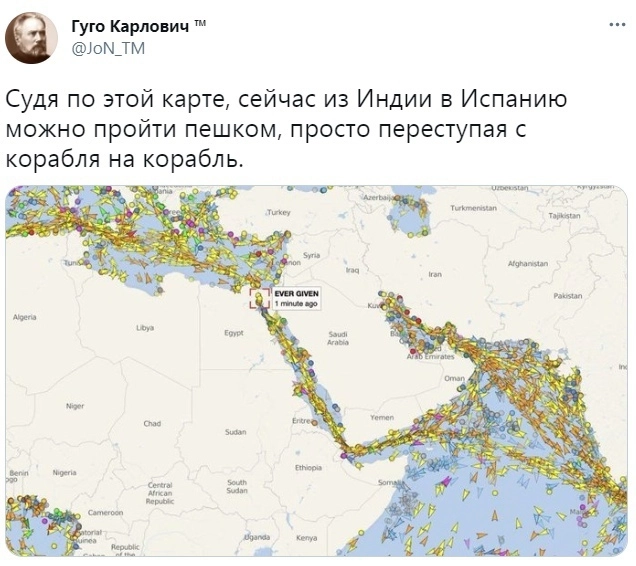23 марта панамский контейнеровоз Ever Given, идущий из Китая в нидерландский порт Роттердам, застрял в Суэцком канале. Инцидент полностью парализовал движение и создал пробку, в которую попали более 300 кораблей. И пока страховые компании подсчитывают убытки, а экономисты пытаются предугадать, как скажется авария на мировой экономике, пользователи соцсетей делают то, что у них получается лучше всего, — мемы.