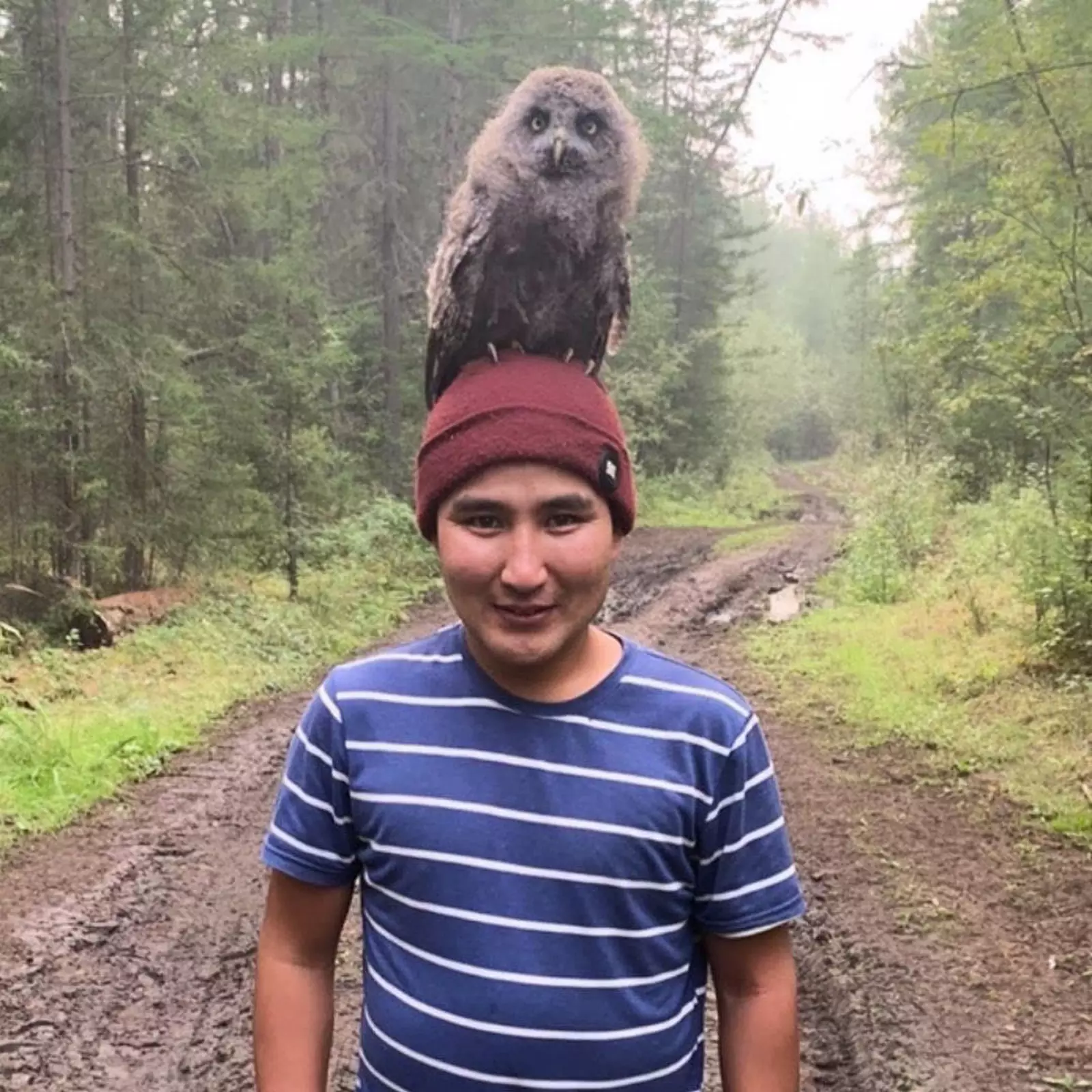 Во время тушения лесных пожаров в Якутии был спасён птенец совы, который сел на голову своему спасителю.