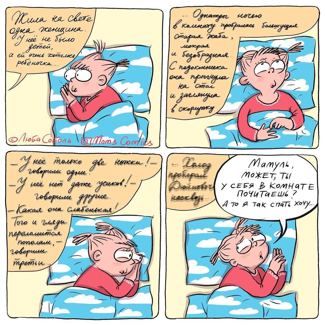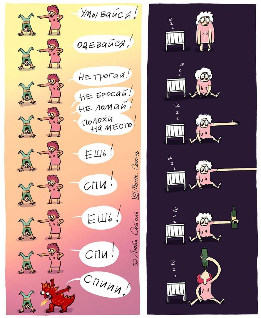 7. «Комикс про мою подругу Зиночку. Она старается быть идеальной мамой, но не всегда получается. Сегодня у Зиночки был тяжёлый день. И это не пропаганда! Я не поддерживаю употребление алкоголя, но понимаю)))»
