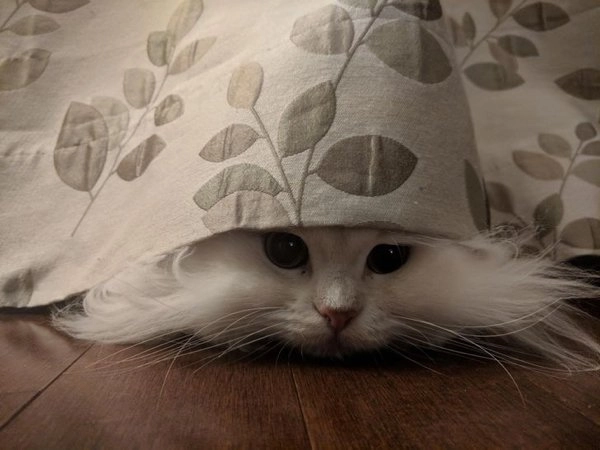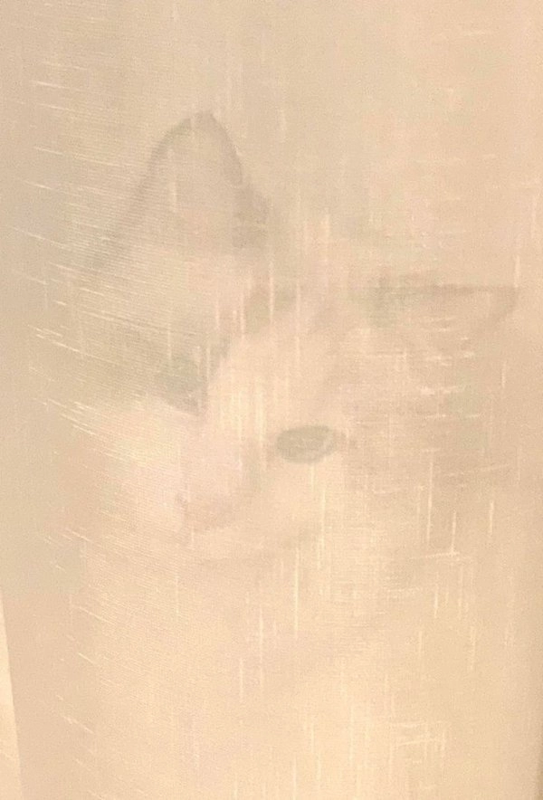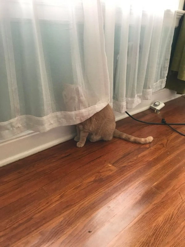 Домашние питомцы, как и маленькие дети, тоже любят играть в прятки. И точно также они наивно думают, что их не видно за прозрачной занавеской или травой.