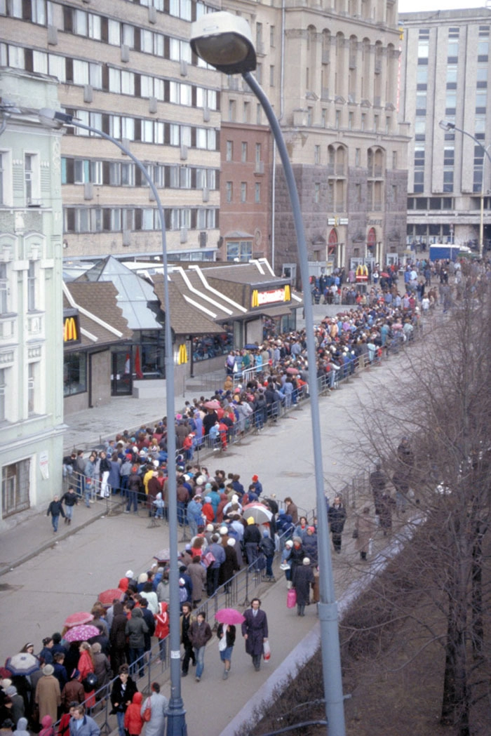 Сейчас фраза «открытие ресторана „Макдоналдс“» звучит вполне обыденно, но в 1990 году в Советском Союзе новость об этом была сродни разорвавшейся бомбе. Основатель сети быстрого питания McDonald’s Canada Джордж Коун вёл переговоры с советскими чиновниками с 1976 года, когда встретился с ними на Олимпийских играх в Монреале. Почти четверть века спустя договорённости были достигнуты, строительство началось 3 мая 1989 года на Пушкинской площади. Ресторан на 900 посадочных мест открылся 31 января 1990 года.