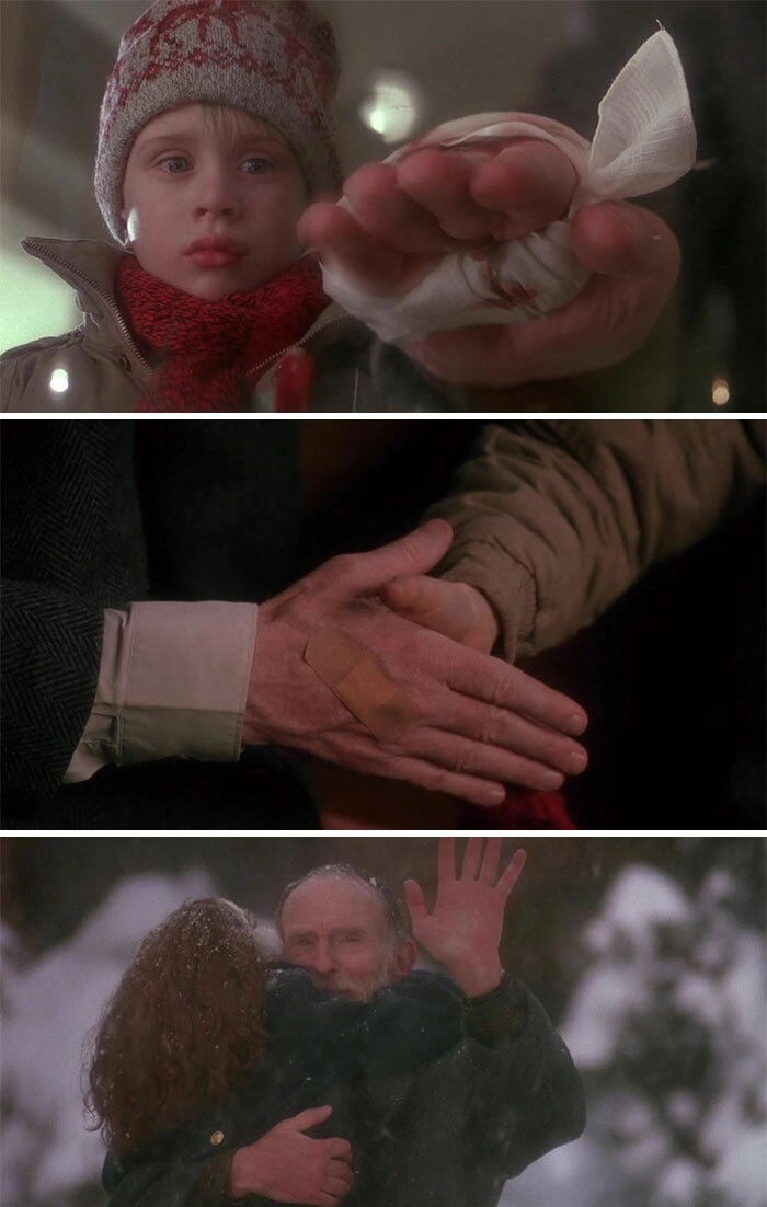 При первой встрече у старика Марли на руке была старая кровоточащая рана. Когда он начинает общаться с Кевином, то на руке мужчины можно заметить уже пластырь. А после примирения героя с сыном его рука в полном порядке. Эти сцены символизируют затянувшуюся душевную рану Марли