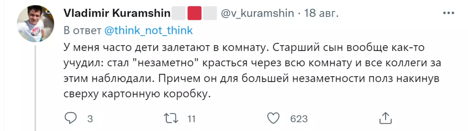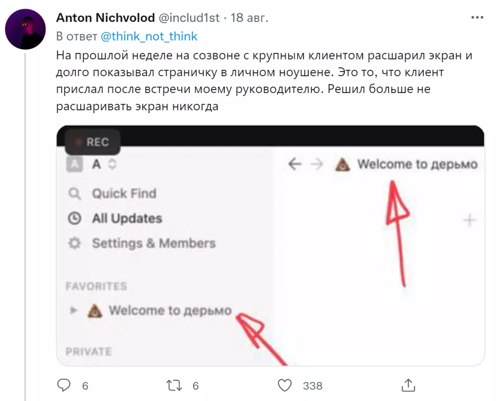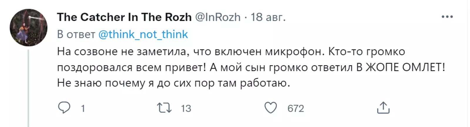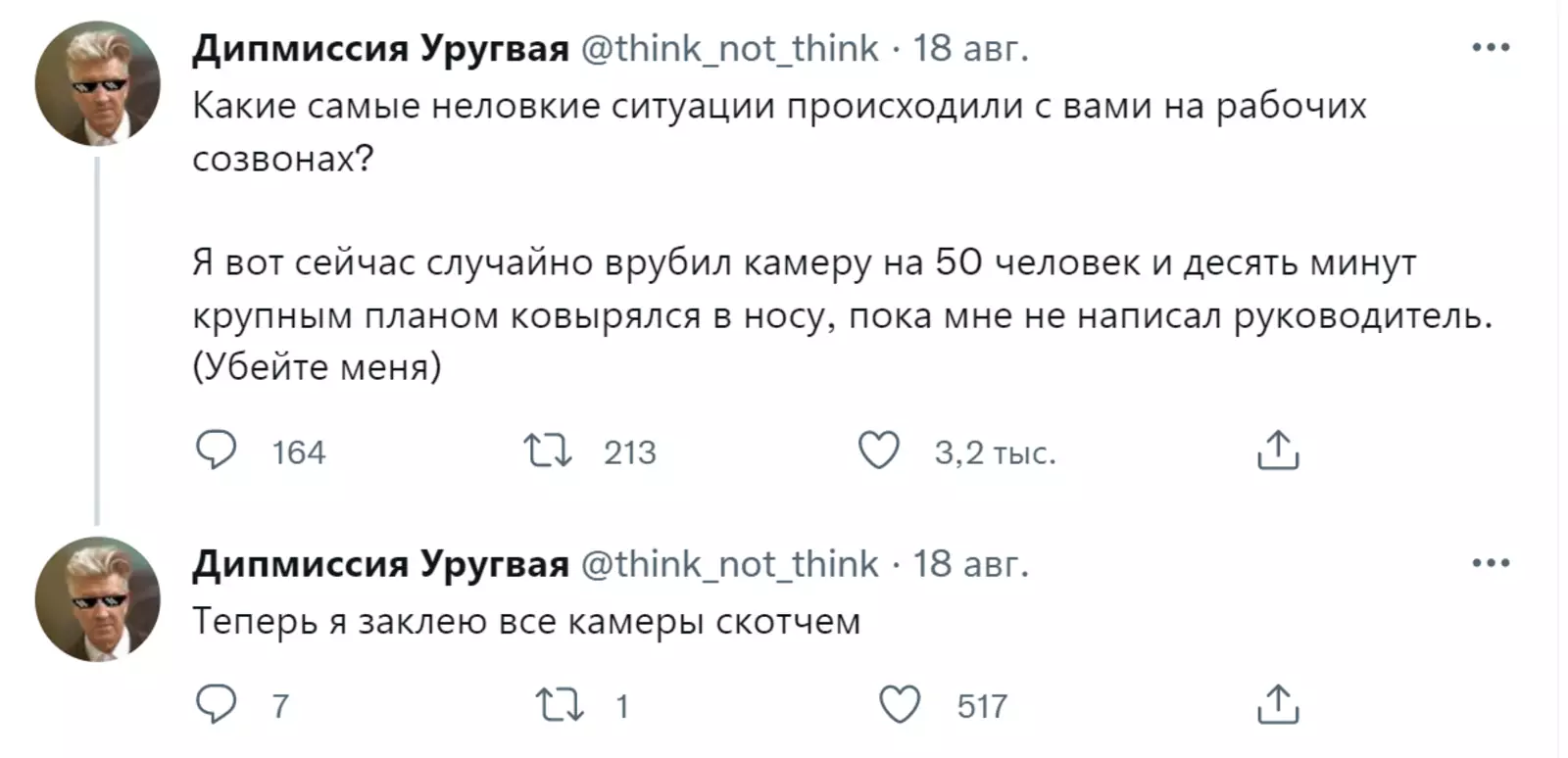 Пользователь Twitter под ником think_not_think запустил тред, в котором юзеры начали делиться своими фейлами с рабочих созвонов. И это очень смешно.