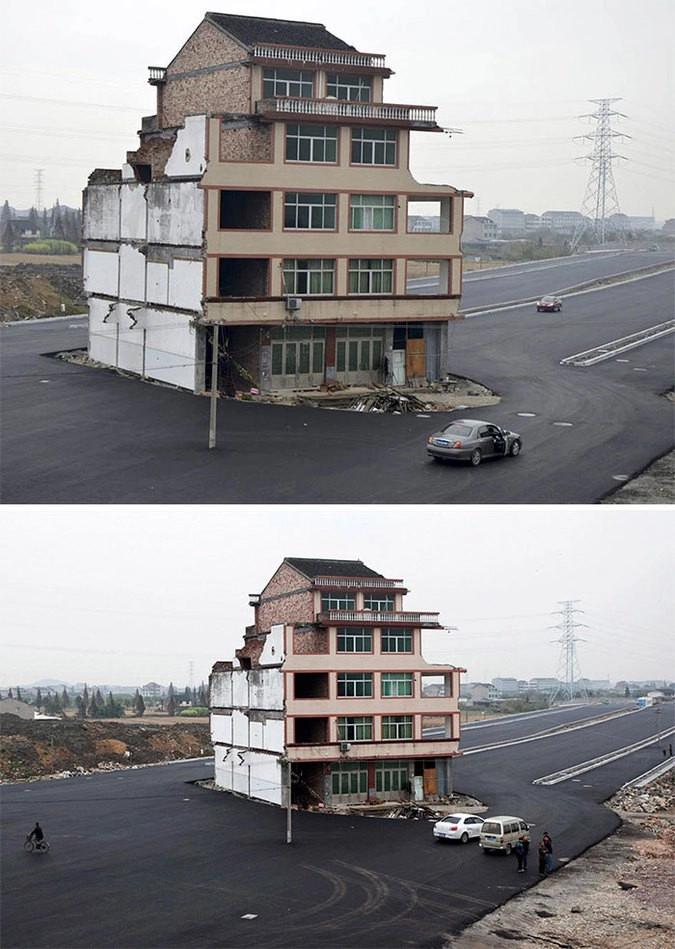 Вокруг этого дома в Китае построили скоростное шоссе, в конце концов жители переехали оттуда, но дом стал настоящим символом сопротивления наглым застройщикам.