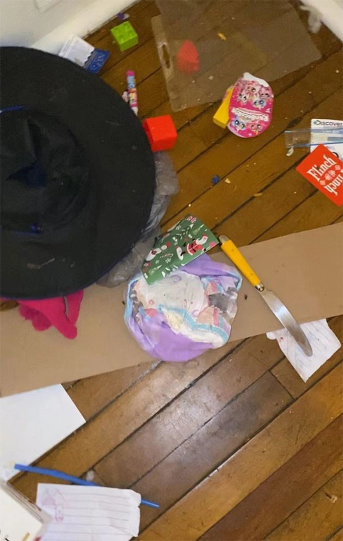 «Застывшие и ставшие частью пола остатки еды недалеко от кровати»