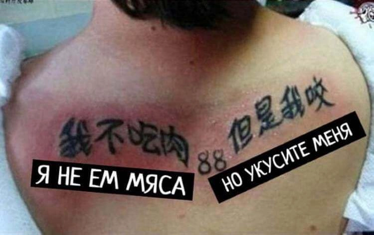 Мой друг хотел сделать себе тату с надписью „Я вегетарианец“. В итоге ему набили иероглиф, означающий „Я овощ“.