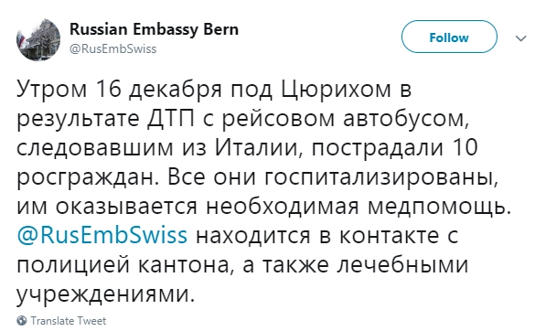 Утром 16 декабря под Цюрихом в результате ДТП с рейсовом автобусом, следовавшим из Италии, пострадали 10 российских граждан. Все они госпитализированы, им оказывается необходимая медпомощь, — говорится в официальном Twitter-аккаунте российского ведомства.