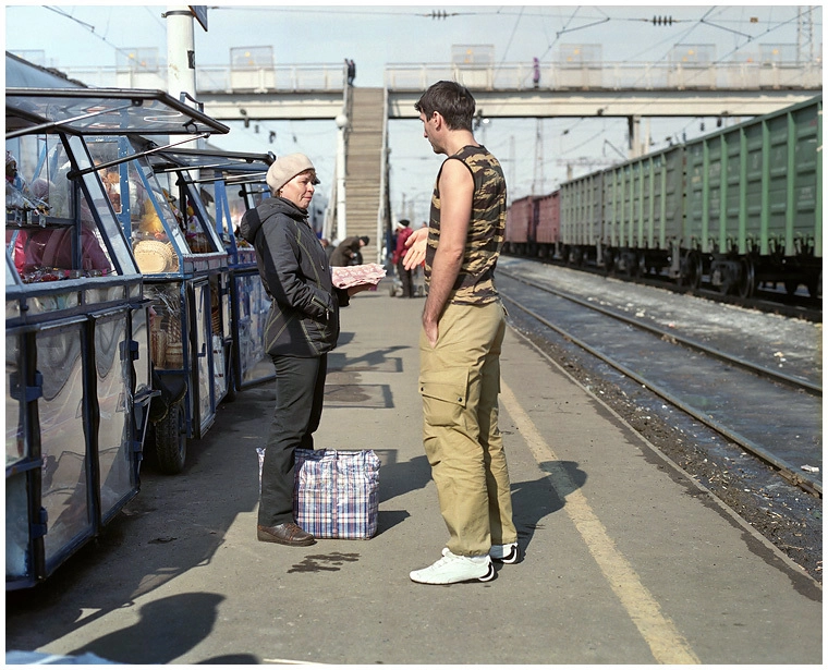 Себастьен Тиксье подметил, что в поезде Москва - Владивосток встречаются очень разные люди, причины поездки которых также разные. Например, он коротал переезд от города в город, слушая анекдоты попутчиков в окружении стаканов с водкой. Когда поезд останавливался на очередном вокзале - все дружно спускались на перрон к торговцам, чтобы купить овощи и разводные супы. Автор отмечает, что без этих уличных торговцев «ритм путешествующего был бы не таким насыщенным».