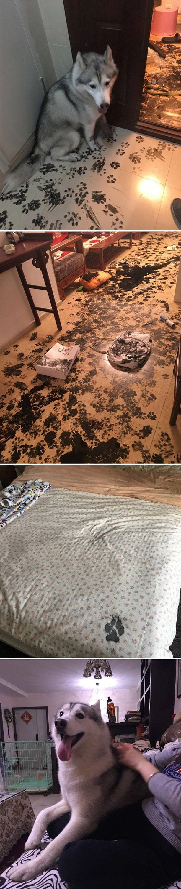 4. «Пока хозяева были в кино, пёс сильно скучал, поэтому разбомбил и испачкал всю квартиру, кроме кровати. Потому что ему туда нельзя залезать»