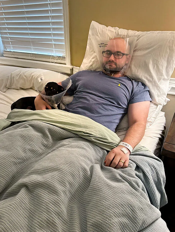 «Не прошло и дня после того, как нашей собаке удалили опухоль, а мне сделали экстренную аппендэктомию. Моя жена заботится о нас обоих».© Соцсети