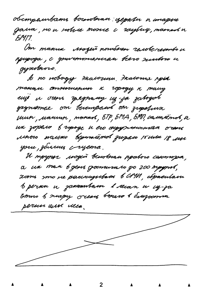 ...Потом люди, которые не любили старые дома, улицы, людей, которые проживали на юго-востоке Украины, начали обстреливать восновном: церкви и старые дома, но и новые тоже с гаубиц, танков и БМП. От таких людей погибнет человечество и природа, с уничтожением всего живого и духовного…