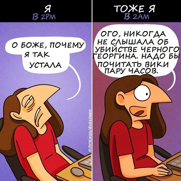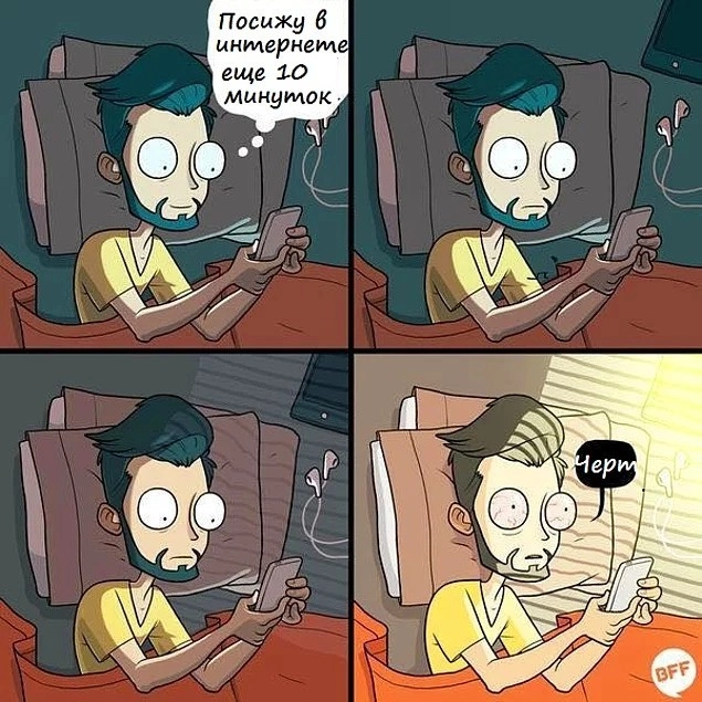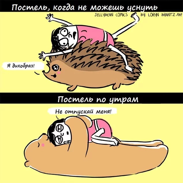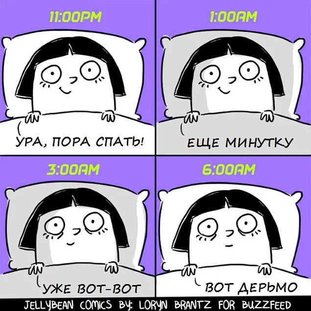 О чём больше всего мечтают взрослые люди и что меньше всего любят маленькие дети — конечно же спать! На эту тему существует множество шуток и остроумных мемов. Например, как ложиться спать вечером, если ты работал весь день и совсем не жил, и вот перед сном хочется хоть немножко пожить. Ведь нужно столько всего успеть — и новые сериалы посмотреть, и книги почитать. Не зря один мудрец сказал: «Если любишь кого-то, дай ему поспать». Собрали смешные и жизненные комиксы для тех, кто никак не может выспаться.