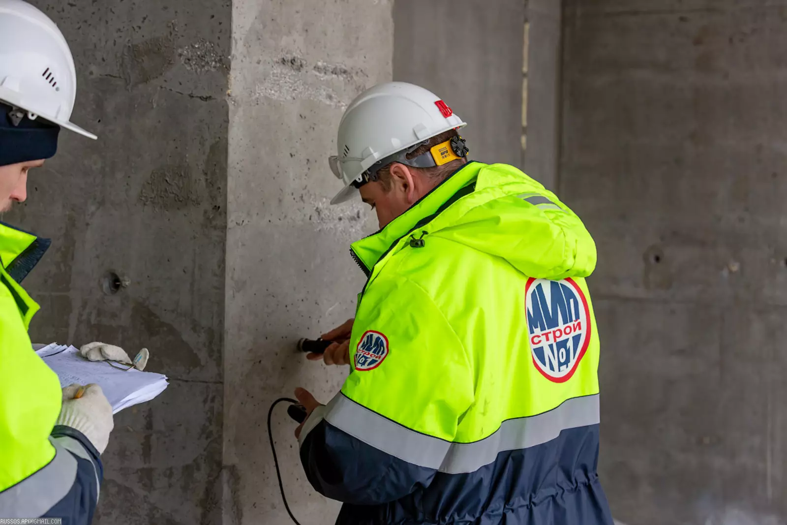 14. Контроль работ производится на всех этапах — на фотографии специалисты лаборатории проверяют свойства бетона. Вообще, хочу отметить повышенные меры по охране труда, которые ввели на всех объектах «Мосинжпроекта». Все это способствует сохранению жизни и здоровья всех находящихся на площадке. Особенно при работе на большой высоте.