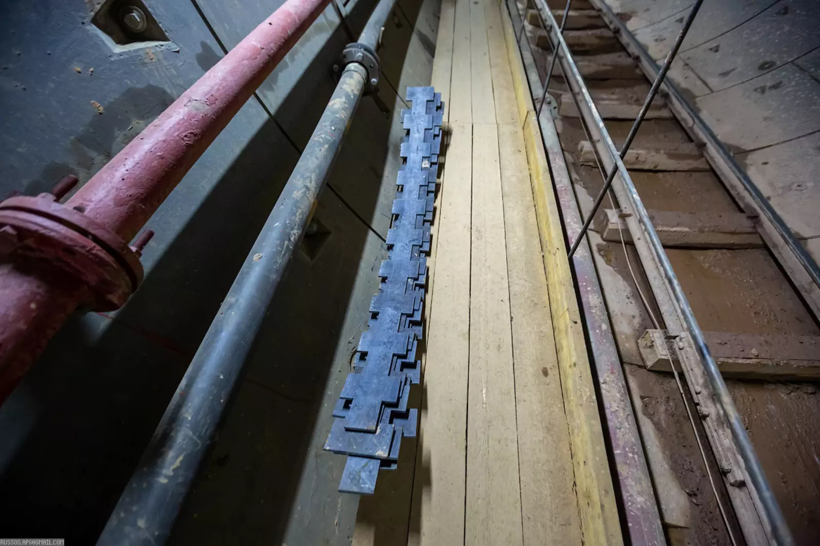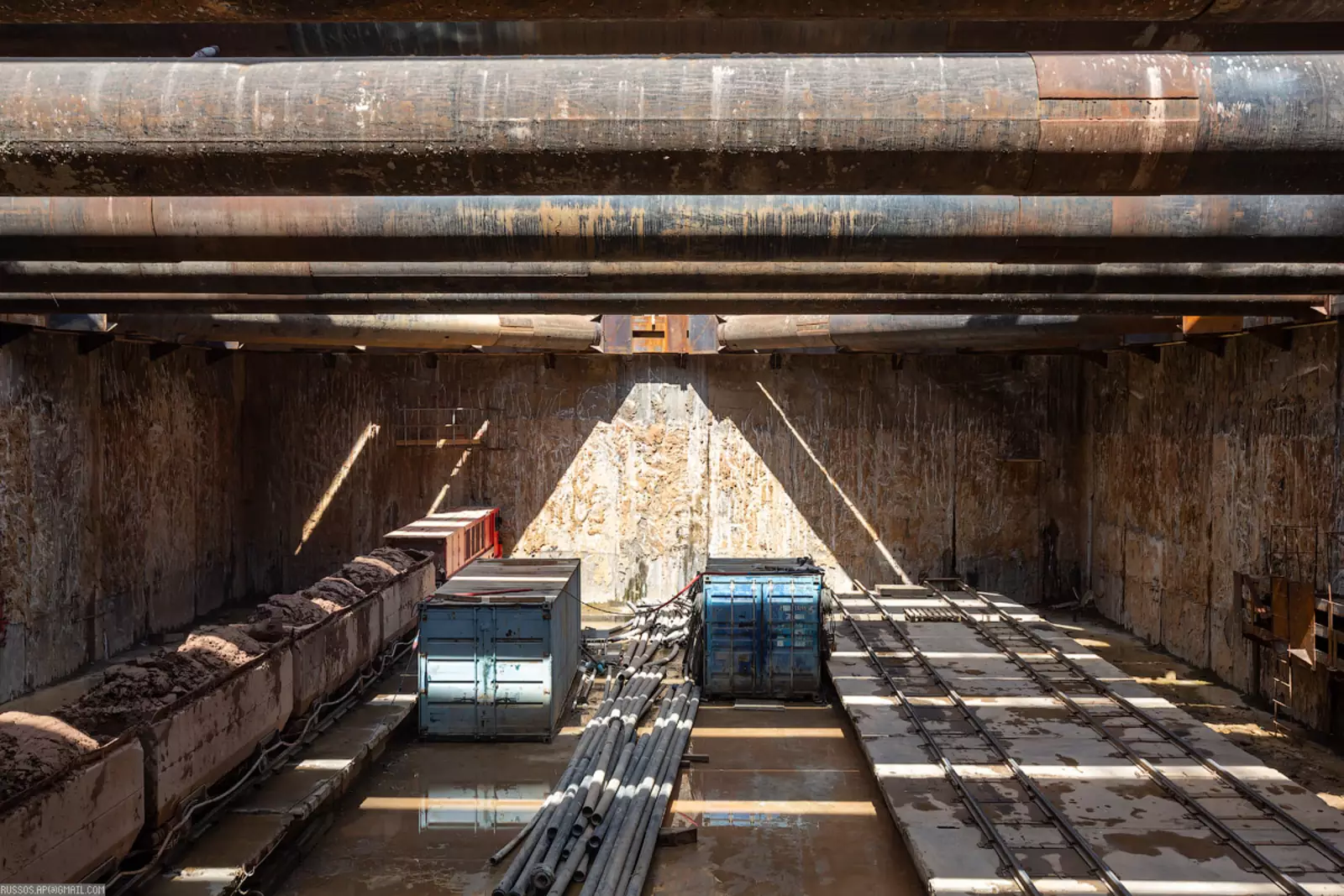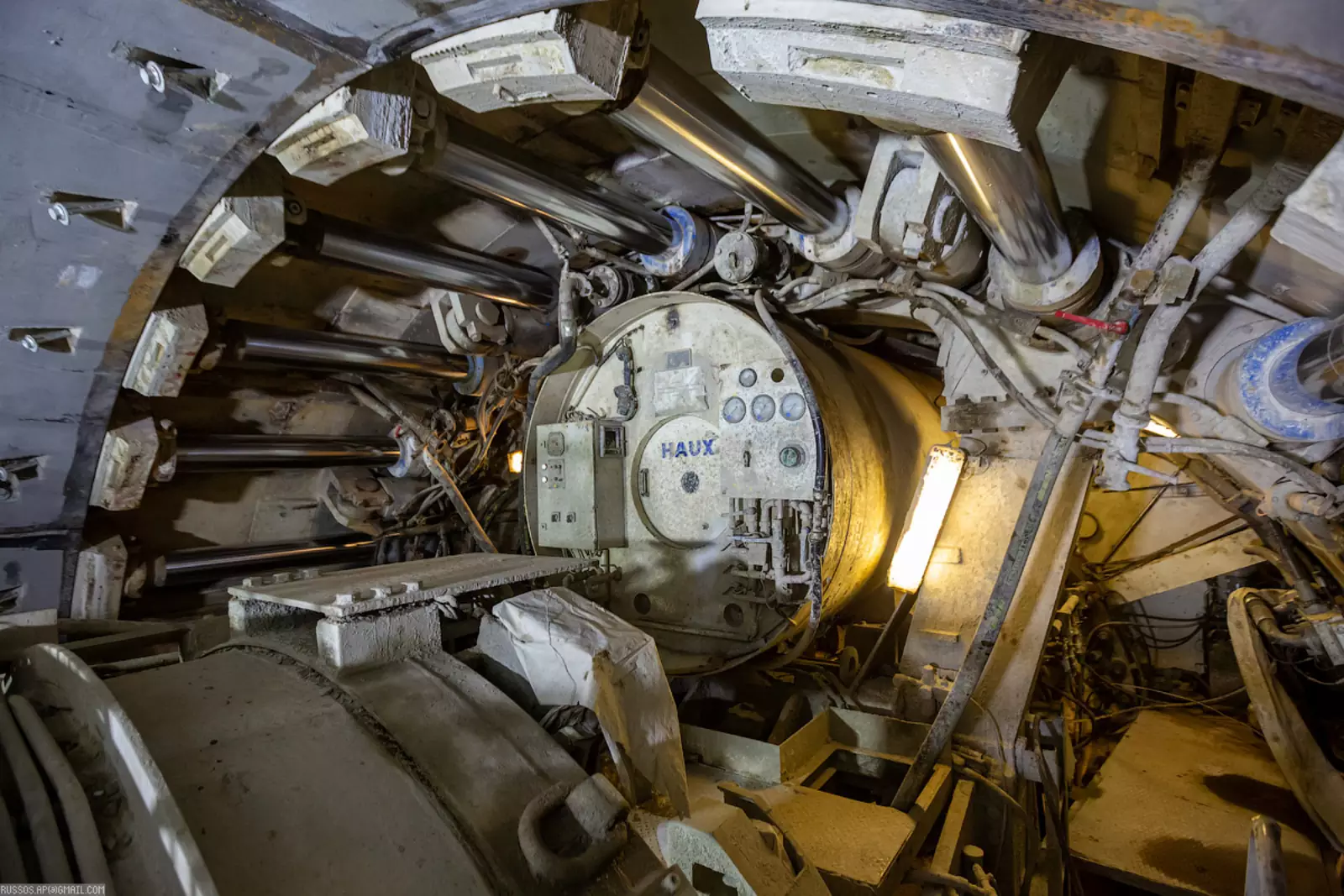 13. Если кто вдруг забыл, как выглядят домкраты щита — то вот они. Ими он отталкивается от готовой обделки, продвигая щит вперед. Круглая бочка — барокамера. В современных реалиях нужна крайне редко для выхода в призабойную камеру при смене режущего инструмента ротора. Обычно длину проходки рассчитывают так, чтобы менять шарошки и резцы надо было после проходки, но на длинных плечах щит может остаться «без зубов» где-то на трассе. В подавляющем большинстве случаев из призабойной камеры выбирают весь грунт, максимально прижимают ротор к породе, закрепляя таким образом забой. Если воды нет, то барокамера не используется по назначению — в ней открыты обе двери. А вот если гидростатическое давление воды большое, то барокамера работает как шлюз. Воду в забое отжимают высоким давлением воздуха — получается кессон. Но, как я написал, высокое давление сейчас используется чрезвычайно редко.