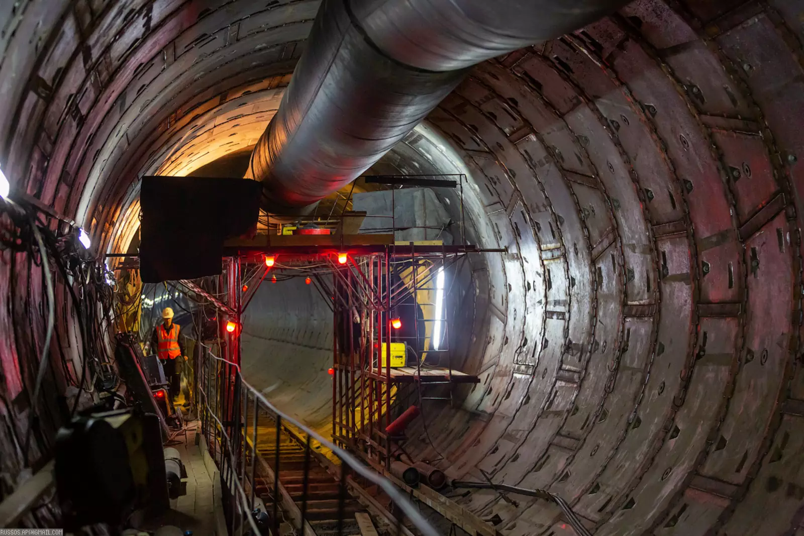 11. Работы ведутся под инфраструктурными объектами на глубине от 12 до 35 метров в водонасыщенных мелких и средней крупности песках, суглинках и глинах. Щит движется в среднем со скоростью 7 метров в сутки.