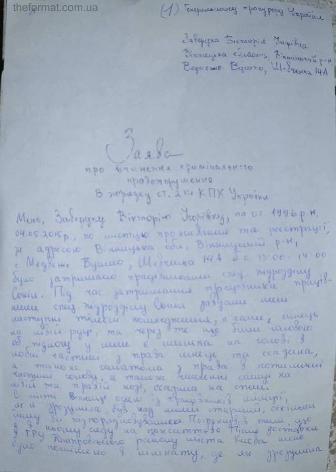 Собственноручно написанное Заверухой заявление на имя генпрокурора было передано через ее адвоката Виктора Смалия. В заявлении она сообщает, что ее били, шантажировали и принуждали к даче ложных показаний.