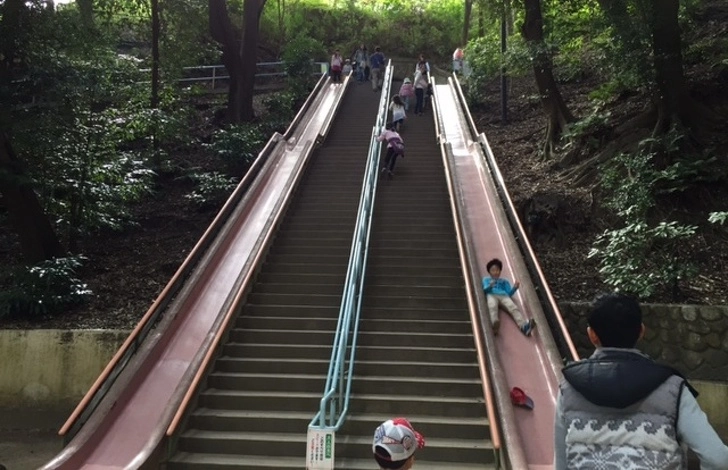 2. К лестнице пристроили горку для тех, кто не хочет спускаться по ступенькам.