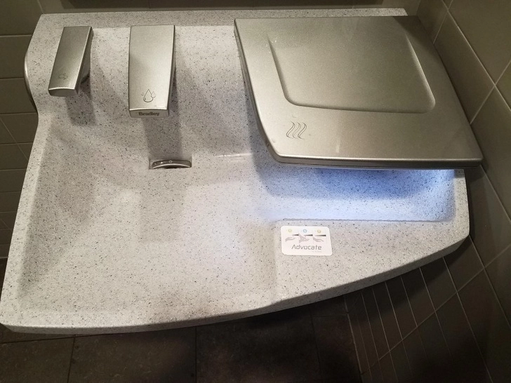 16. Кран для воды, дозатор для мыла и сушилку для рук объединили в одной компактной раковине.