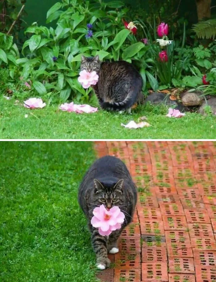 «Эта кошечка ждёт, когда опадут цветы, и тщательно выбирает лучшие из них, чтобы подарить своей хозяйке».© Соцсети