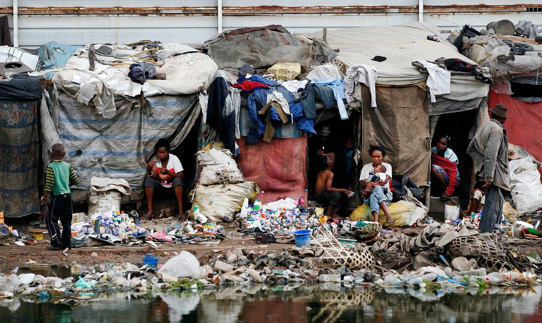 Жители трущоб сидят рядом со своими домами вдоль канала сточных вод в столице Мадагаскара Антананариву.