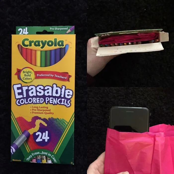 «Мой муж всегда получал цветные карандаши на день рождения и Рождество, когда был маленьким. Он их ненавидит, потому что он дальтоник. Муж всегда хотел iPhone, поэтому сегодня я купила ему его и упаковала вот так».© Соцсети