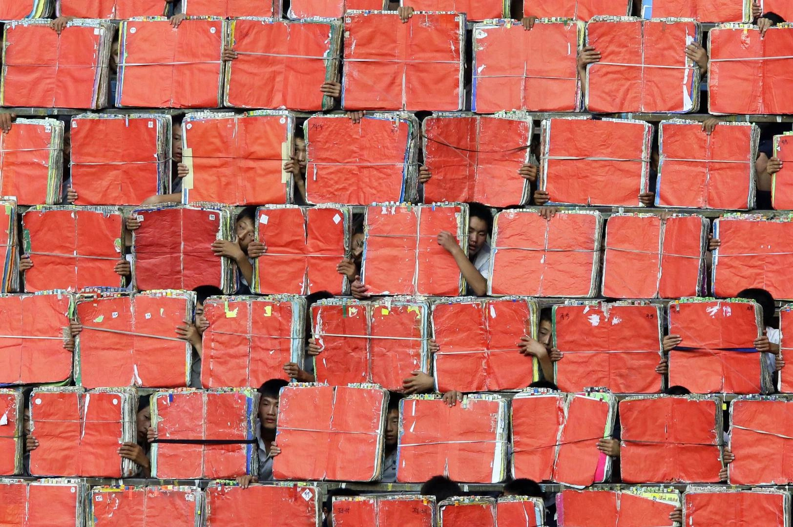 Корейцы держат в руках картон, создавая тем самым фон для массовых гимнастических выступлений в Пхеньяне.