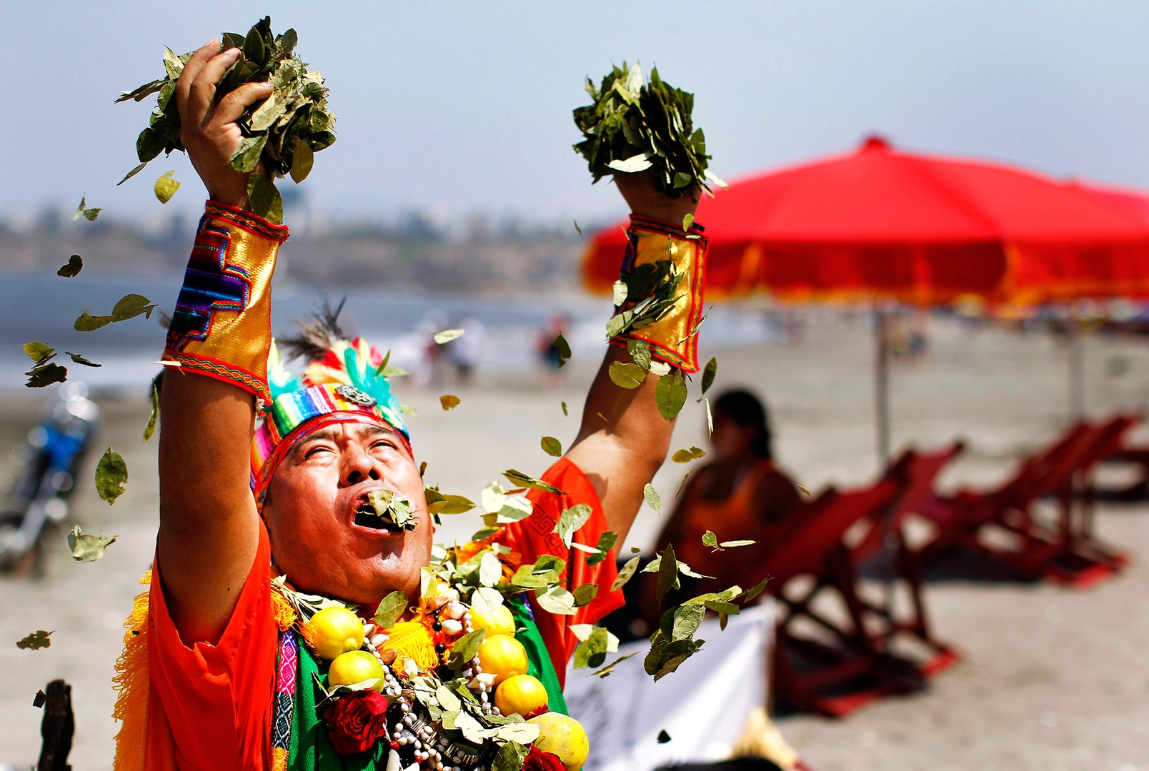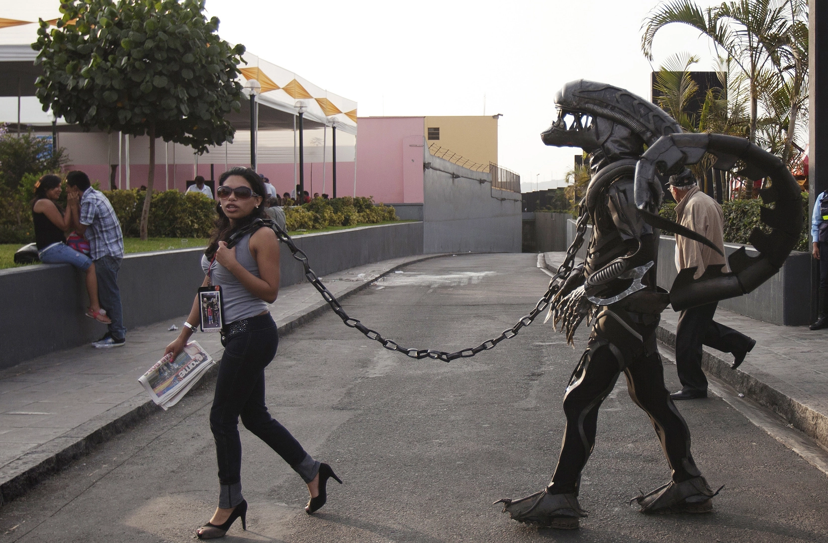 Женщина ведет на поводке человека в костюме чужого во время празднования 478-й годовщины испанского основания в городе Лиме, Перу.