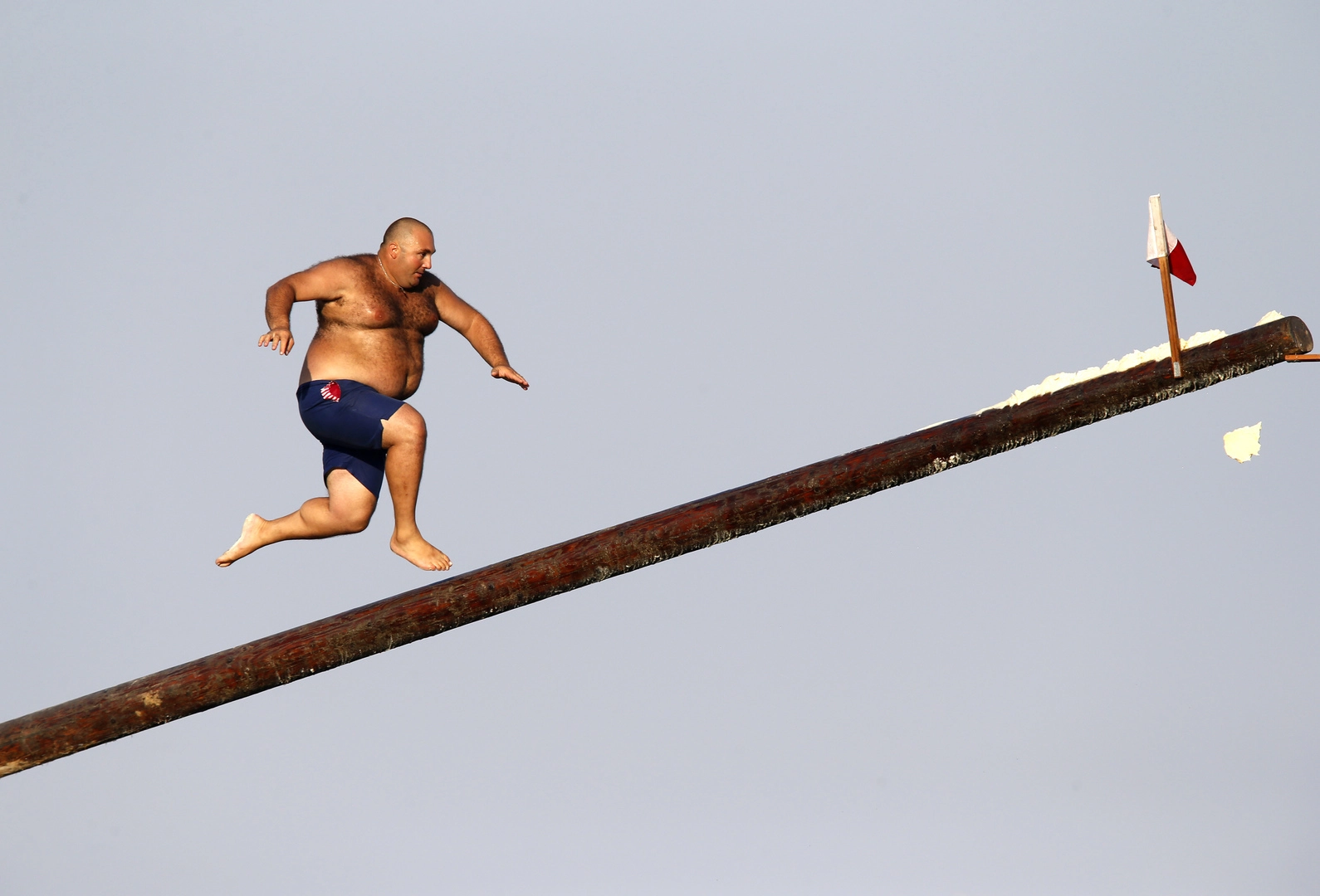 Мужчина участвует в соревновании, где нужно пробежать по бревну, намазанному жиром, до флажка. Действо происходило на Мальте.