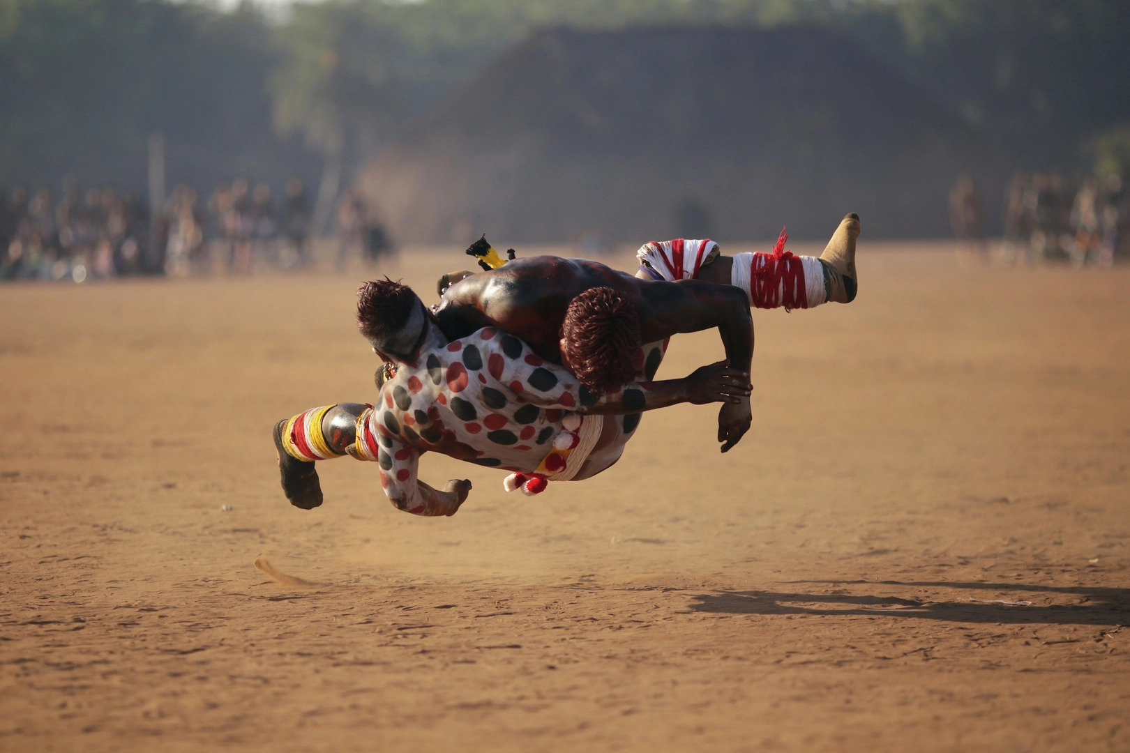 Индейцы борятся во время ритуала quarup в национальном парке Шингу Бразилии.