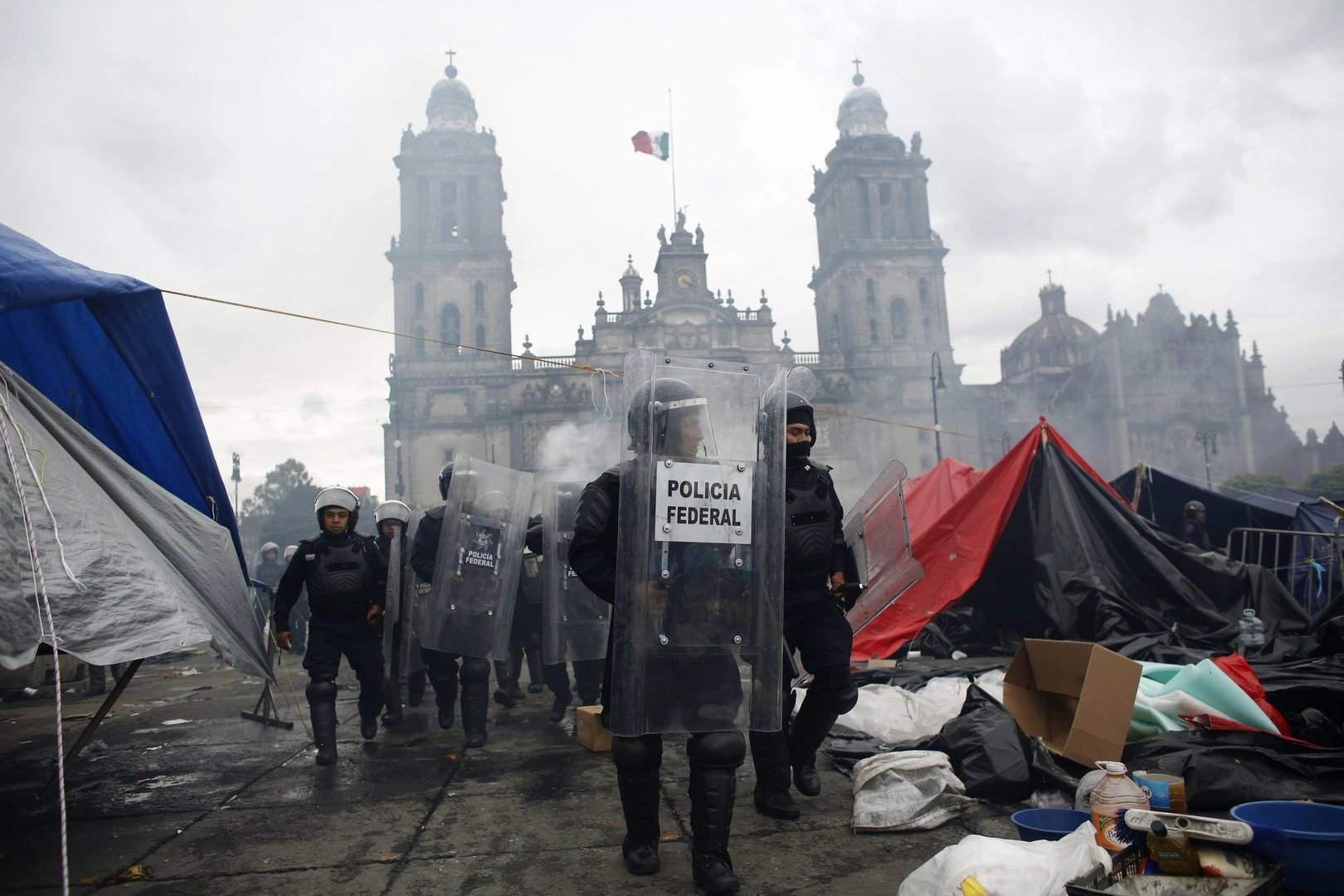 Полицейские идут перед собором в Мехико, разгоняя демонстрантов, выступающих за радикального президента Энрике Пена Ньето.