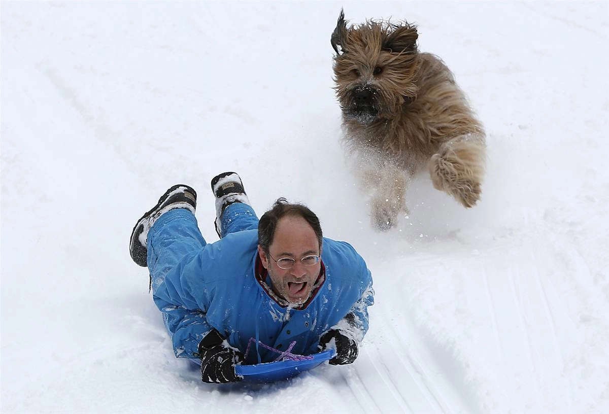 Мужчина и его собака радуются первому за два года настоящему снегопаду в Нью-Йорке, скатываясь с горки в Центральном парке.