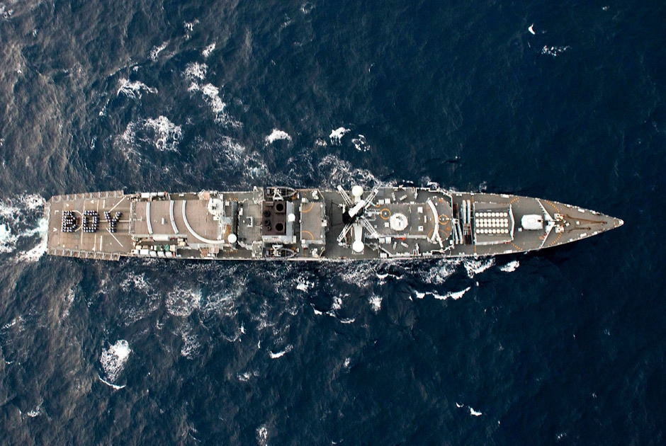 Команда корабля Королевского флота формирует слово "мальчик" на кормовой части палубы, чтобы отметить рождение нового принца Великобритании во время патрулирования в Карибском море.