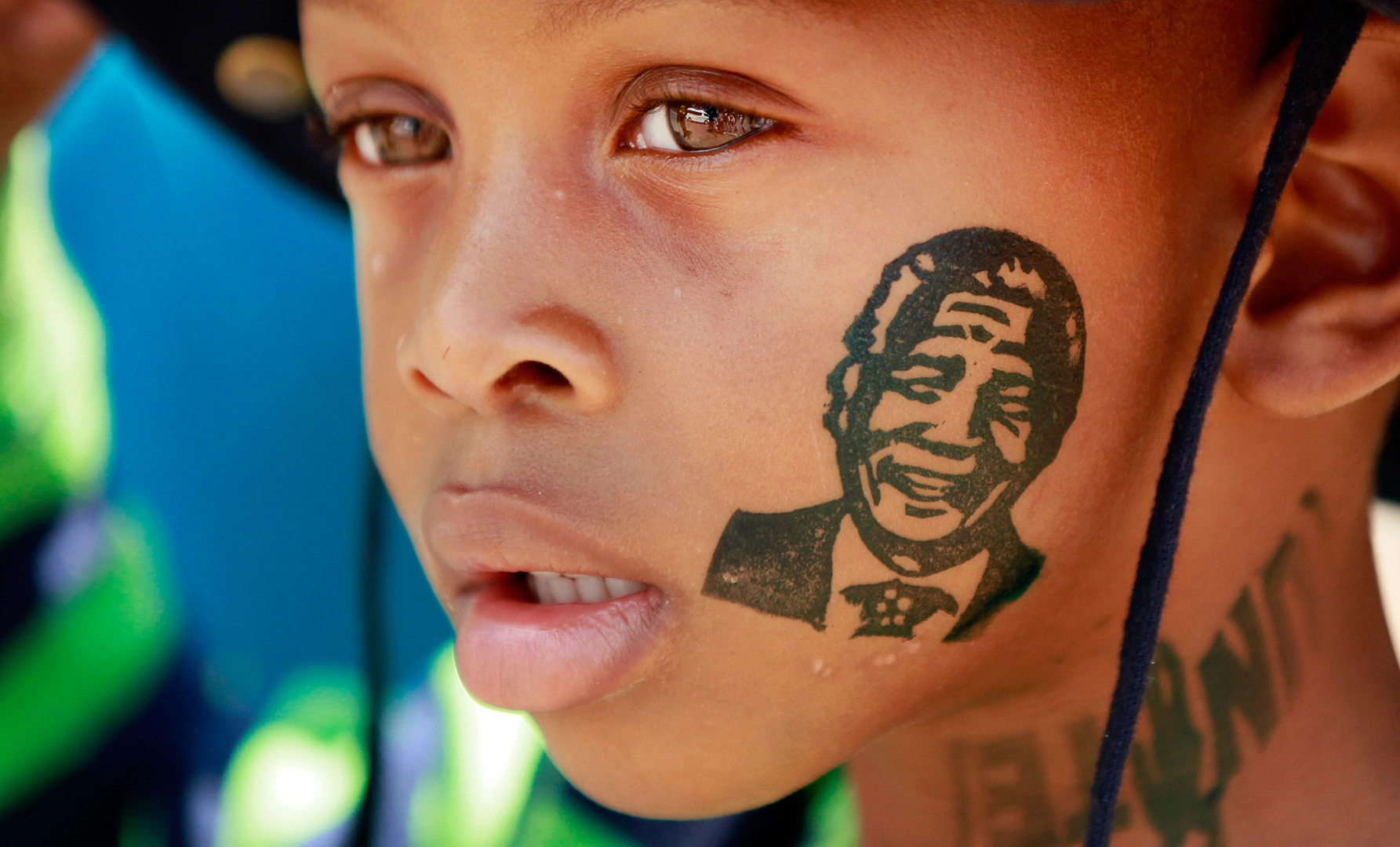 Мальчик с изображением Нельсона Манделы на лице стоит в очереди, чтобы проститься с бывшим президентом в городе Претория.