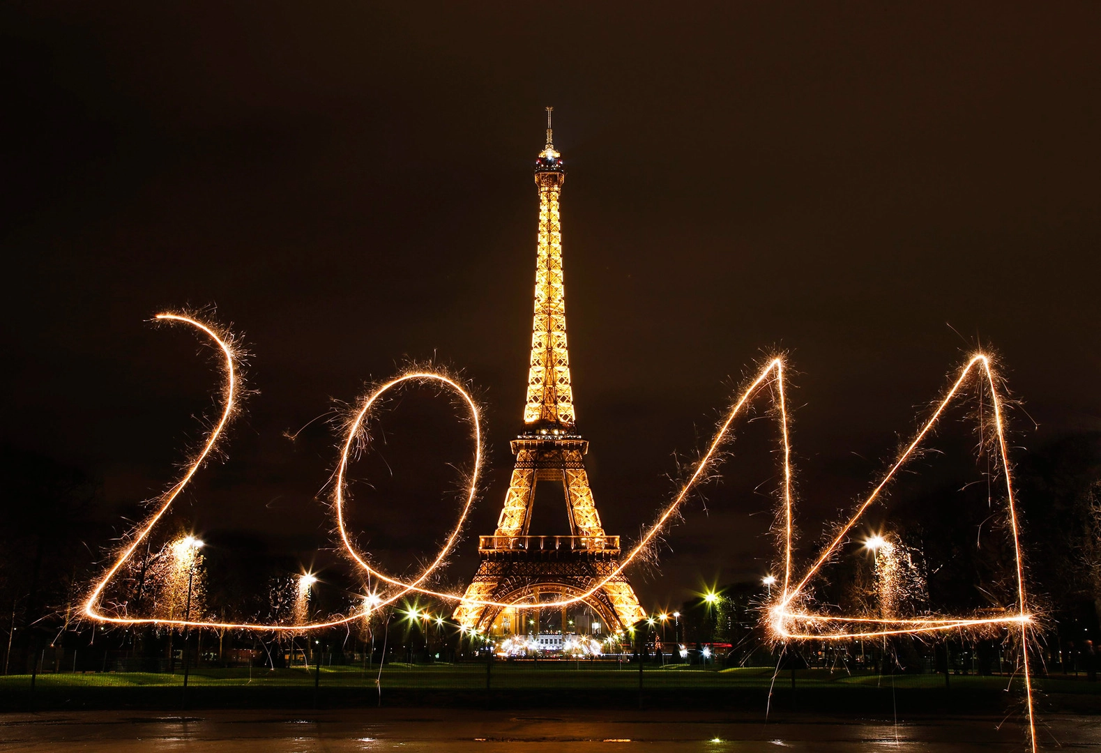 Специальнный эффект создал надпись "2014" на фоне Эйфелевой башни в Париже.