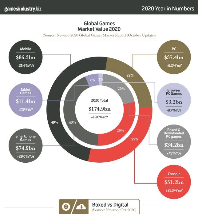 Практически 100% современной выручки от компьютерных игр приходится только на цифровые покупки. Мобильные игры по-прежнему являются самой большой частью пирога, предоставив 46% выручки в 2019 году и 49% в 2020 году.