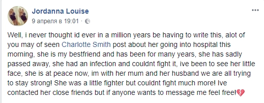 «Никогда не думала, что мне когда-нибудь придется это писать. Многие из вас видели пост Шарлотты Смит сегодня утром о том, что она пошла в больницу. В течение многих лет она была моей лучшей подругой. Сегодня она покинула нас. Она не смогла побороть болезнь. Я видела ее маленькое лицо, она сейчас покоится с миром», — написала она в Facebook.