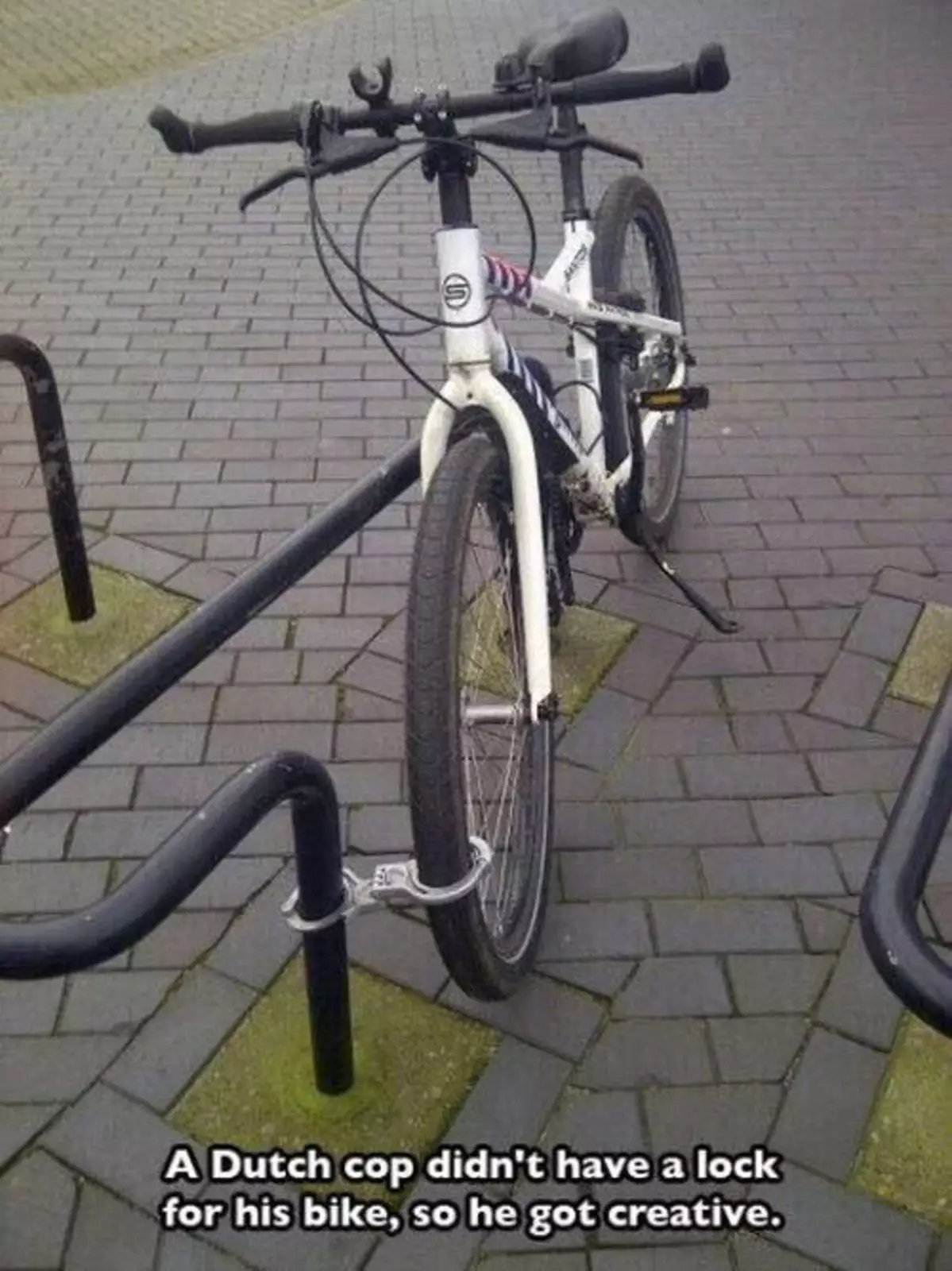 Немецкий полицейский пристегнул свой велосипед наручниками.