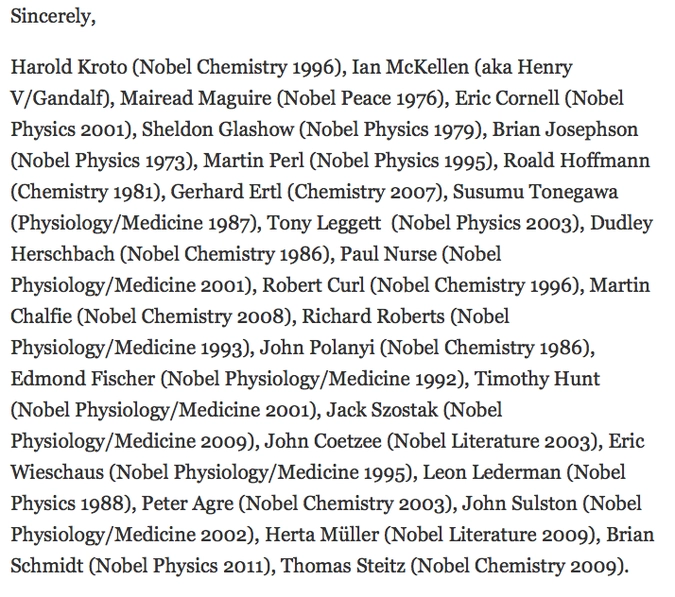 Список нобелевский лауреатов, подписавшихся под обращением.
