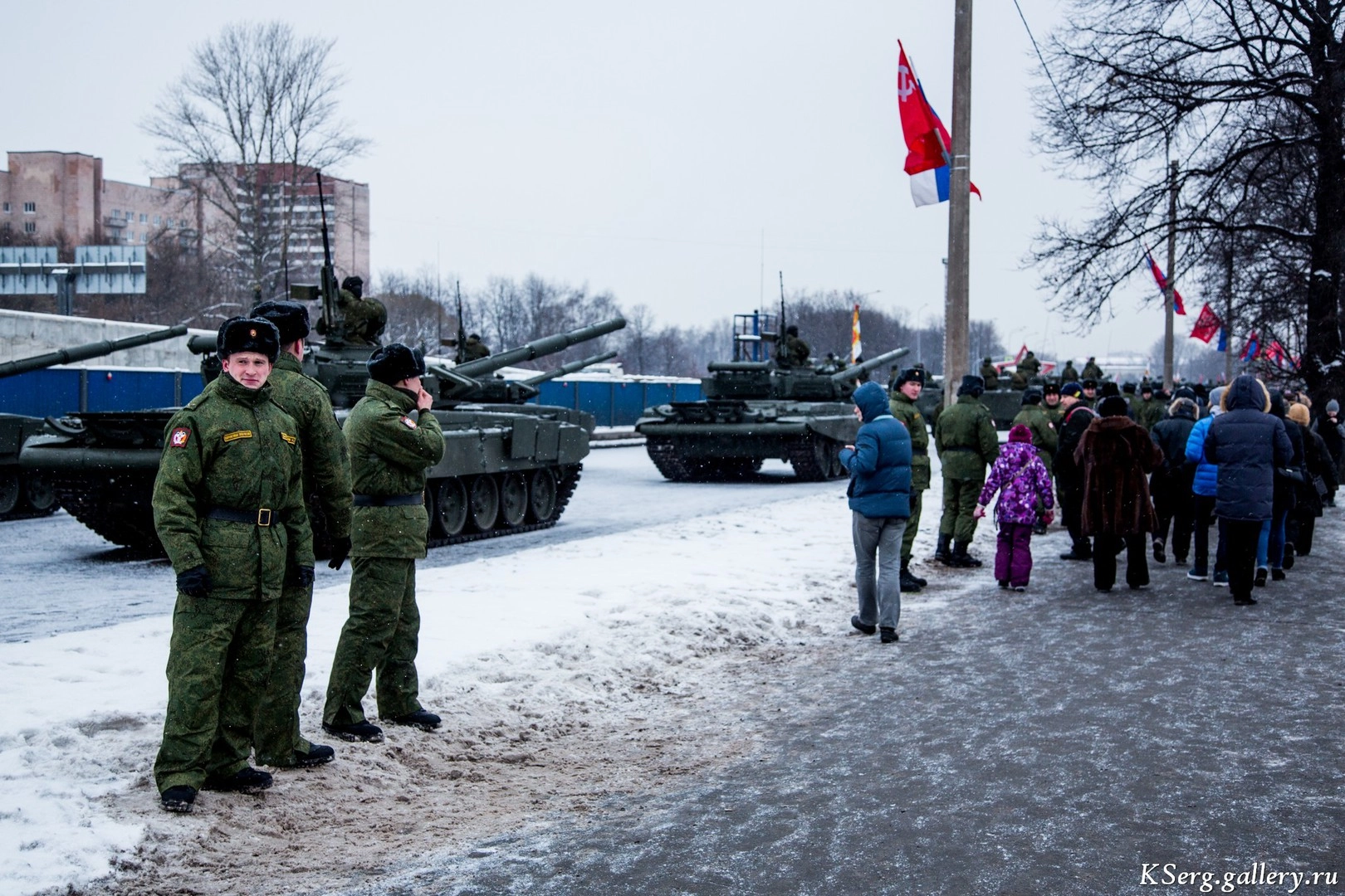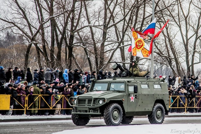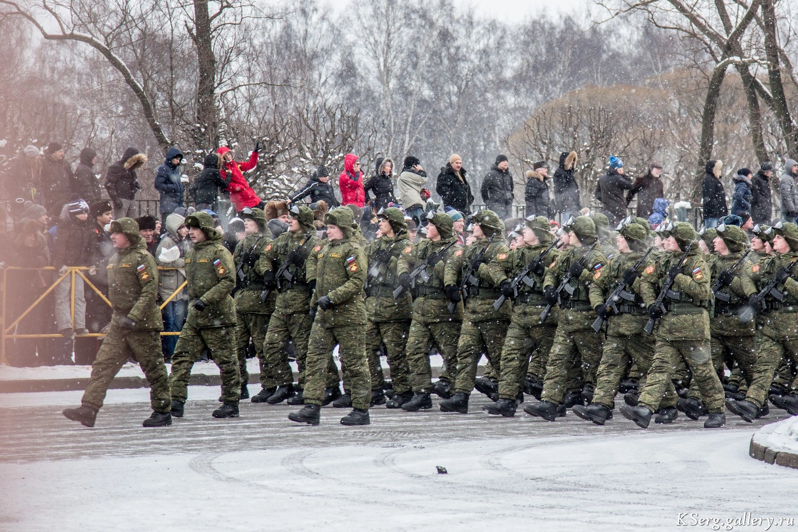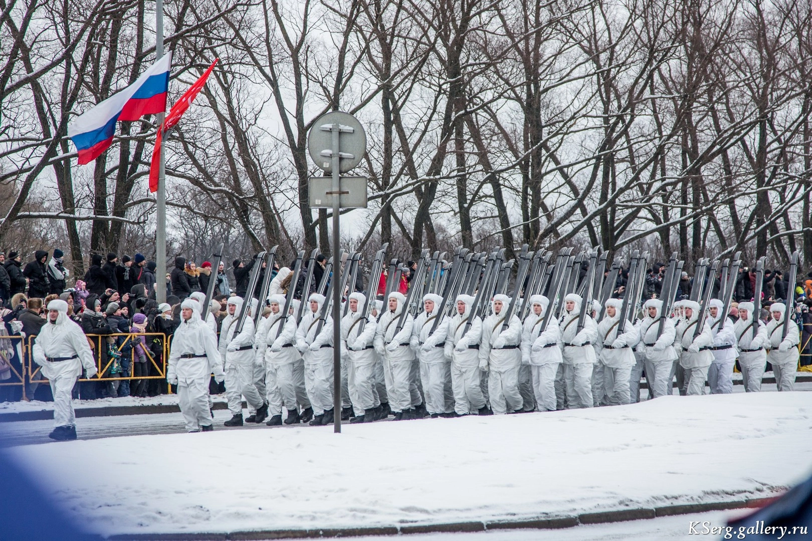 Несмотря на холод, снег, рабочий день и прочие неудобства на параде было немало зрителей, не считая тех, кто разместился на основных трибунах. Люди в несколько рядов столпились у заграждений и оцеплений, чтоб посмотреть на военную технику. Ограждения безопасности присутствовали почти на всем протяжении зоны парада, где их не было, там стояло оцепление из военнослужащих и полиции. Чтобы попасть в зрительские зоны, приходилось проходить через рамки металлодетекторов, однако я, явившись почти к началу парада, не заметил никаких столпотворений из-за ограничения прохода.