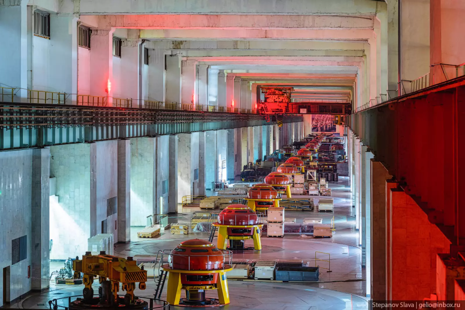 6. Машинный зал. На Чебоксарской ГЭС установлено 17 гидроагрегатов на 78 МВт каждый и еще один — на 48 МВт. В год оборудование вырабатывает более 2 млрд кВт*ч энергии. Над полом машинного зала выступает только верхняя часть оборудования — поворотно-лопастные турбины расположены внизу.