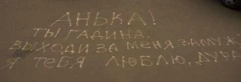 Самое эпическое из этой серии: Анечка, я тебя люблю. Потом зачёркнуто люблю и написано в *** **ал. С припиской: зачем скрывать цель, если она уже достигнута ;)