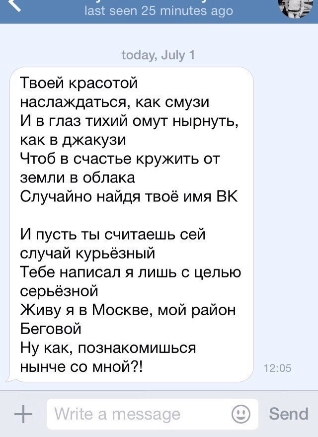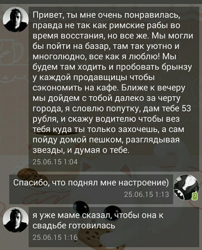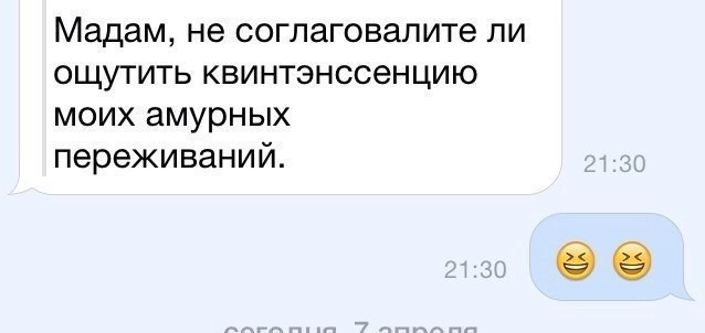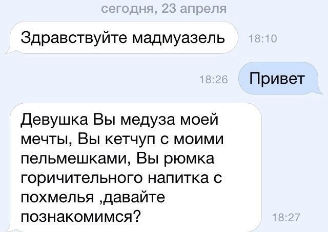 Обольщение — сложная наука, секреты которой постичь удаётся не каждому. Как флиртовать так, чтобы с вами сразу захотели пойти не то, что в кино, но и под венец? Ответ на этот вопрос знают настоящие мастера флирта! Мы собрали для вас подборку сообщений от людей, которые знают толк в кокетстве. Внимание! Если вы захотите использовать какие-то фразы в реальной жизни, редакция «Ридуса» не несёт ответственности за последствия. Но мы искренне желаем вам удачи!