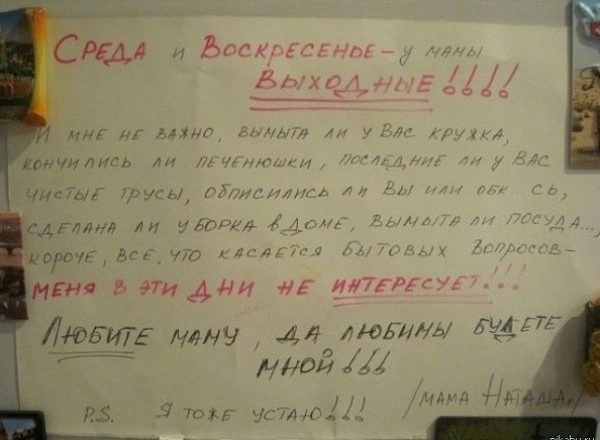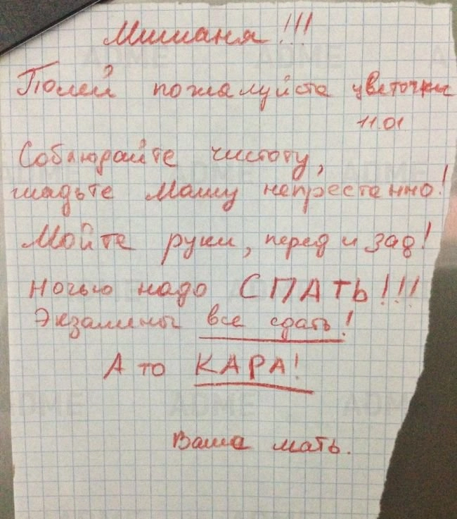 Наши родители любят нас просто за то, что мы есть. И доказательств всепрощающей и надёжной родительской любви можно найти великое множество: от вечного напоминания «Надень шапку!» до откровенных, трогательных и забавных записок, которые оставляют папы и мамы. А ещё у них потрясающее чувство юмора!