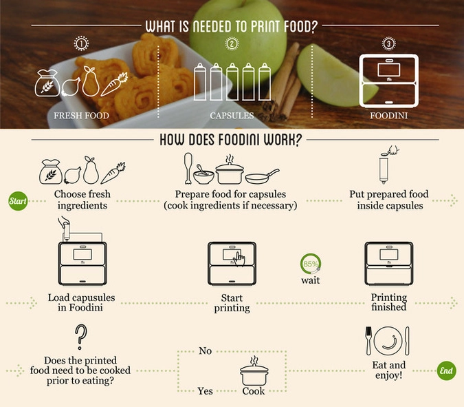 По сравнению с другим прототипами кулинарных 3D-принтеров, "Foodini" сильно фокусируется на использовании свежих и натуральных ингредиентов. Вместо того, чтобы выдавить что-то вроде шоколада в невероятно сложную конструкцию, компания стремится "упорядочить и создать более повторяющиеся схемы в приготовлении пищи, например формирование теста в формы рыбок для крекеров или формирования форм равиоли". Или даже макароны в форме машин, но пока это все рассматривается изобретателями как фантазия.