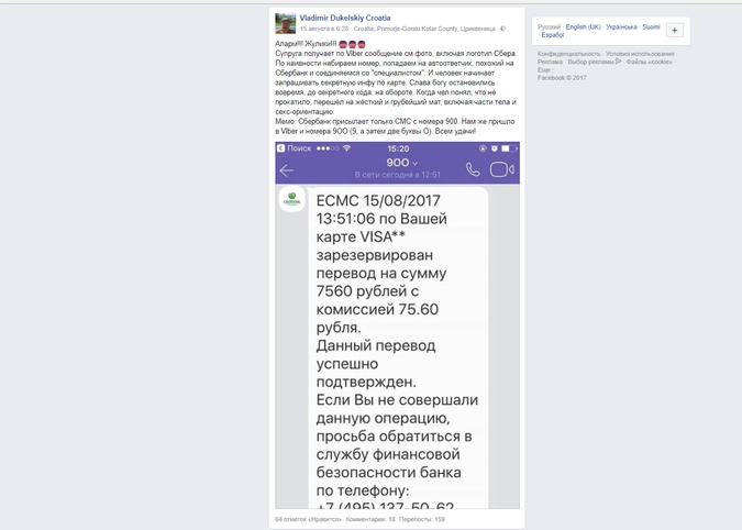 Его жена получила в мессенджере Viber сообщение якобы от «Сбербанка», с его логотипом и с номера 900, в котором было сказано, что по ее банковской карте зарезервирован перевод на крупную сумму, в случае же, если она его не совершала, ей необходимо обратиться «в службу финансовой безопасности» по указанному номеру.