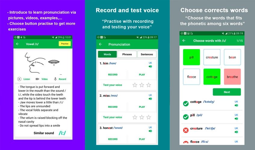 Хорошее произношение крайне важно в разговорной речи. Чтобы собеседники-иностранцы лучше вас понимали над звучанием вашего английского нужно работать. Данное приложение позволяет записывать свой голос для контроля над произношением. Отрабатывать можно не только отдельные звуки, но и интонации. Для каждого звука создана своя карточка, на которой есть схема правильной артикуляции.