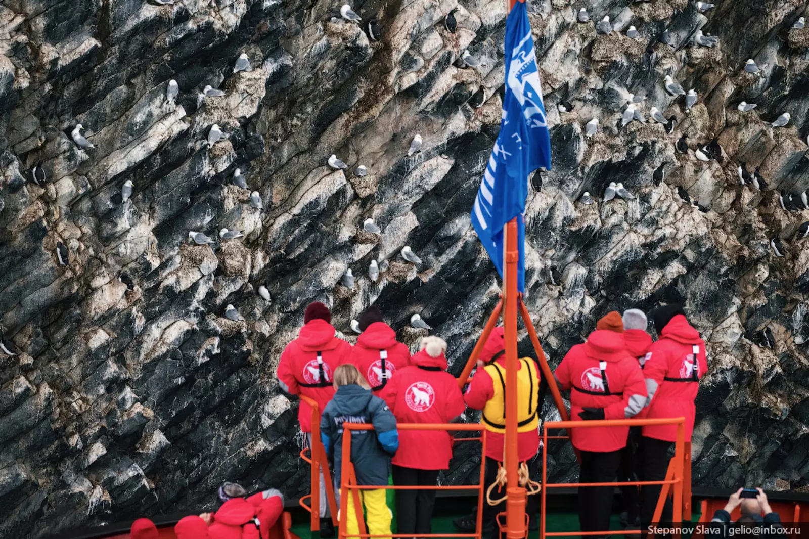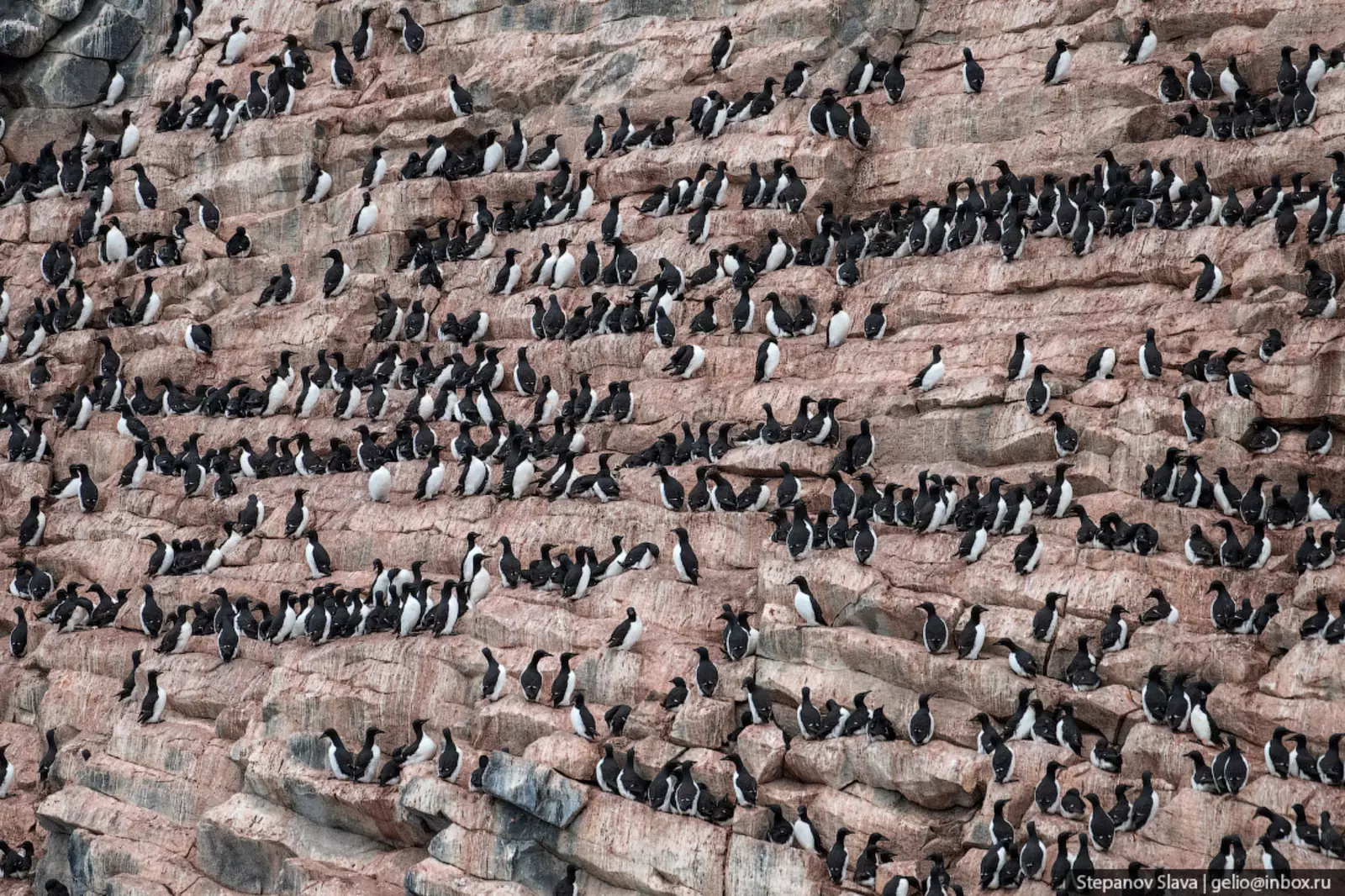 19. Во время экспедиций ледокол близко подходит к скале, птицы на расстоянии нескольких метров. Наблюдения на скале Рубини начались в 1931 году — по ним можно оценивать изменения численности морских птиц на архипелаге.